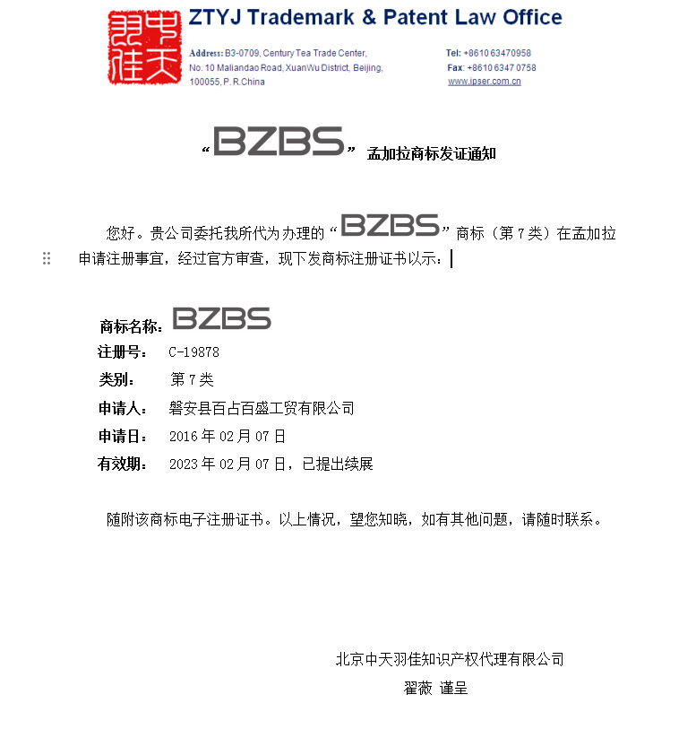 BZBS孟加拉商标发证通知-北京中天羽佳知识产权